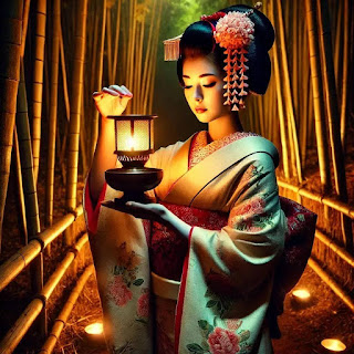 "En medio del silencio del bosque de bambúes, la *geisha, delicada y llena de misterios, anda a paso sereno, iluminando su propio camino.